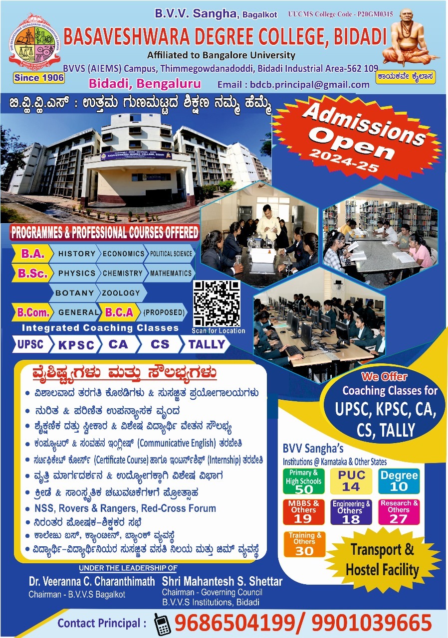 Basaveshwara Degree College was established in 2022 under the aegis of B.V.V. Sangha, Bagalkote, with the vision of imparting quality education with social, human and ethical values with emphasis on “work is worship”. The college is affiliated to Bangalore University and offers undergraduate programmes in Arts, Science and Commerce. The campus is located in a sprawling lush green environment with a serene ambience for a vibrant student life of curricular and extra-curricular activities. The institution is equipped with highly proficient and qualified faculty members to teach and prepare the students to compete and succeed in the competitive world. The institution provides the students with personal support and professional guidance they need to succeed in both personal and professional life. To realize this vision, the college provides coaching by industry experts for competitive exams and other State and Central Board exams.